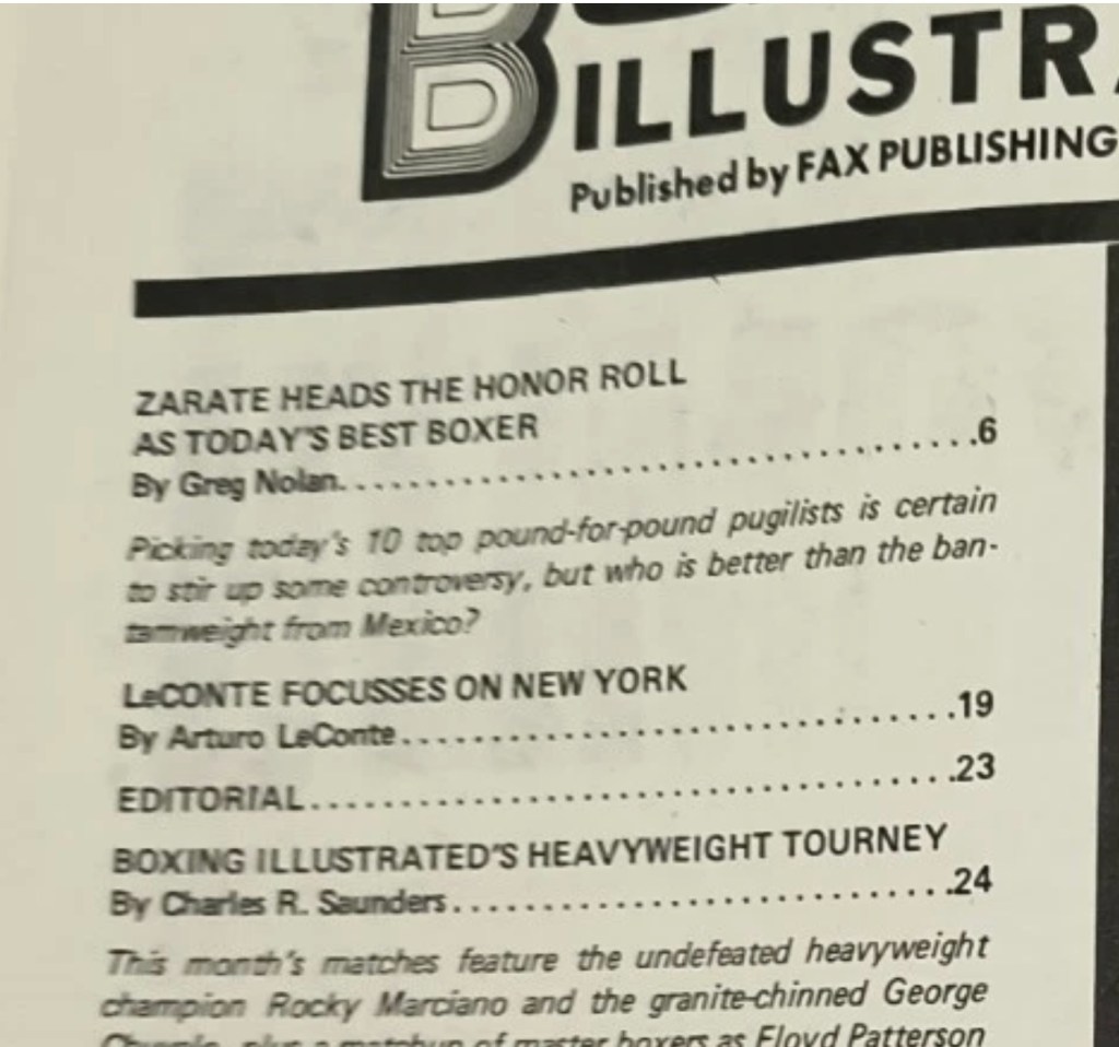 Ah, y como dato, Boxing Illustrated se puede decir fue de los pioneros en hacer los rankings de los mejores Libra por Libra, justamente en los setentas, aunque después dejaron de hacerlo y Ring Magazine tomó la batuta.